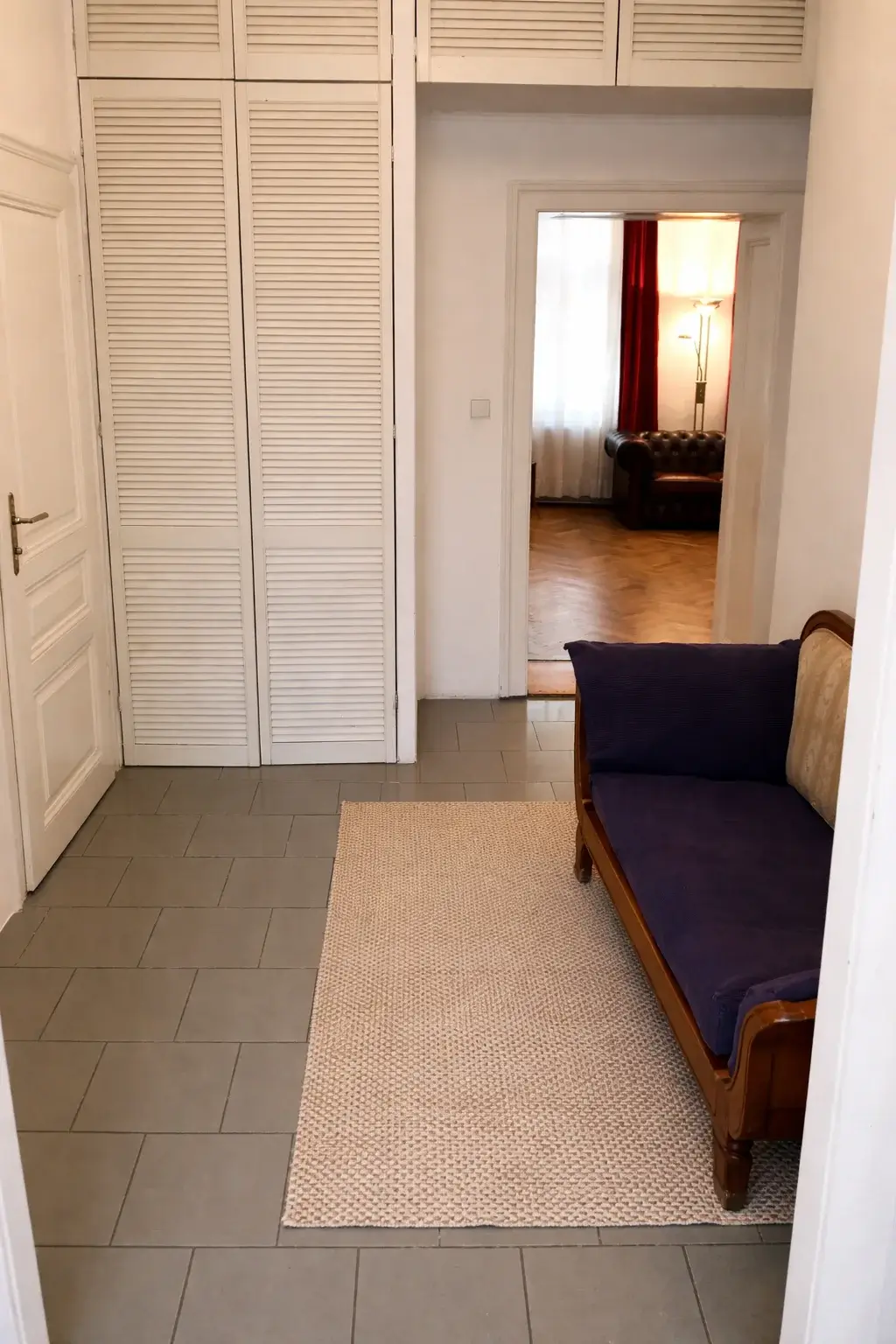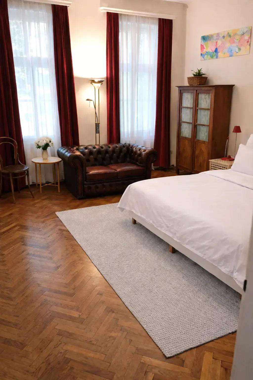 Im Schlafzimmer befindet sich ein komfortables Doppelbett, umgeben von eleganten Biedermeiermöbeln, die dem Raum eine klassische Note verleihen. Die eleganten Vorhänge sorgen für eine angenehme Lichtregulierung und unterstreichen den hochwertigen Charakter der Wohnung.
