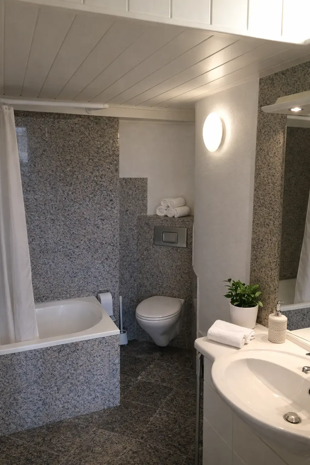 Das Badezimmer und das WC sind praktisch kombiniert und mit einer Badewanne ausgestattet, die zum Entspannen einlädt. Die Küche bietet genügend Platz und alle notwendigen Geräte für die Zubereitung von Mahlzeiten.