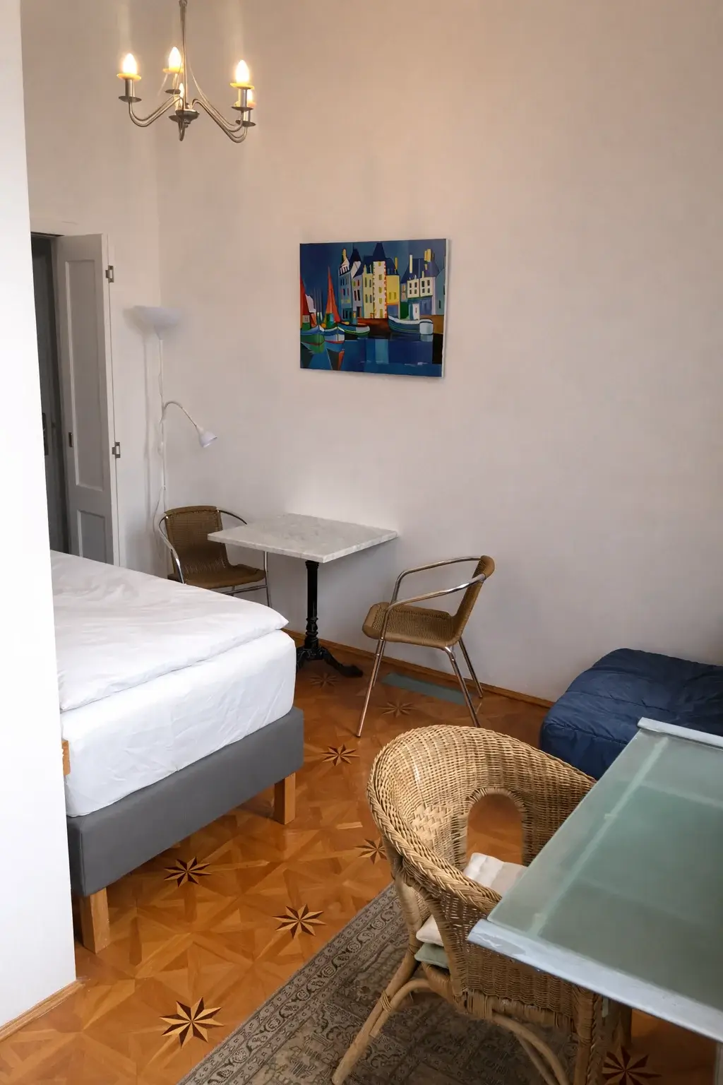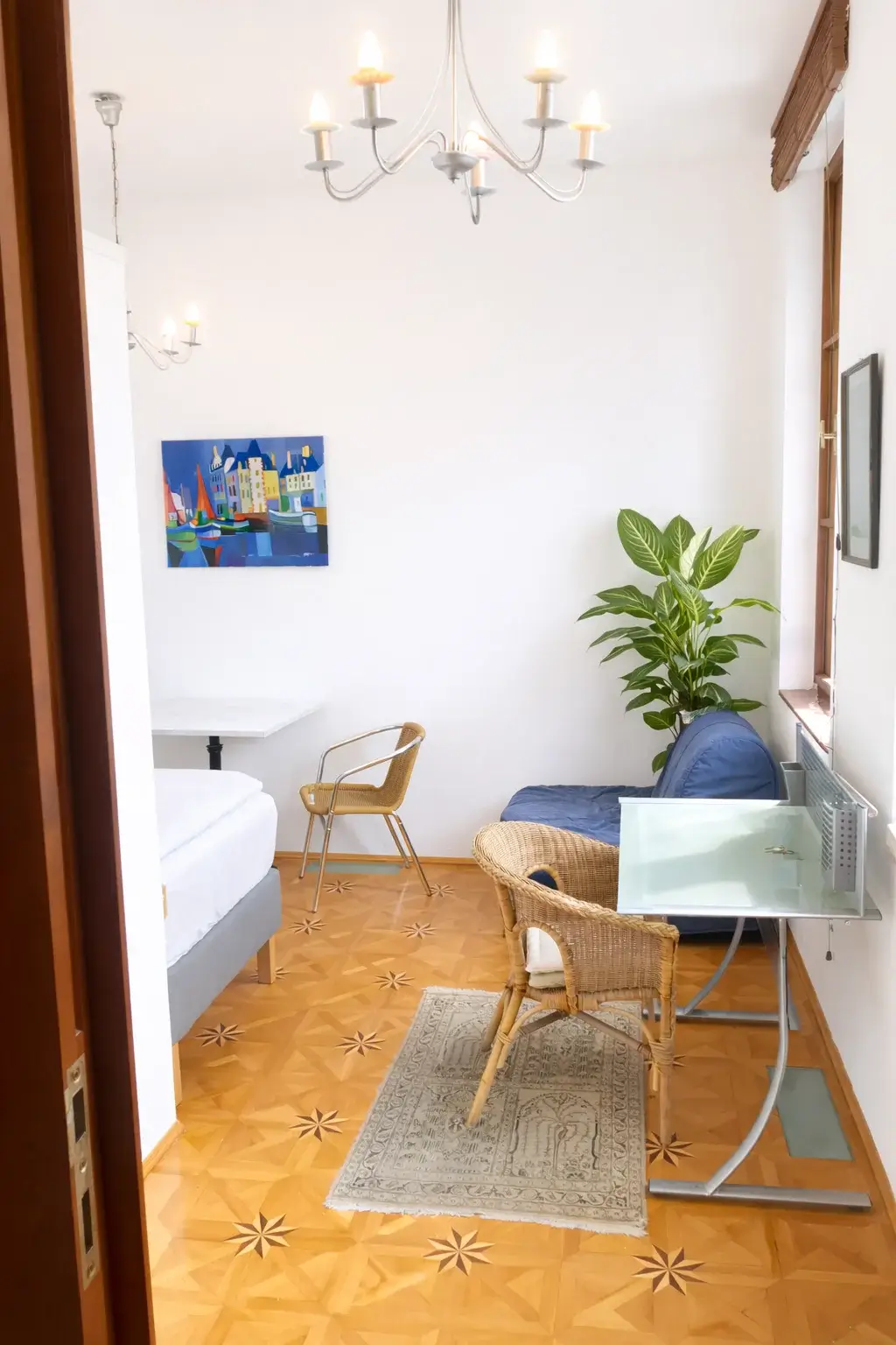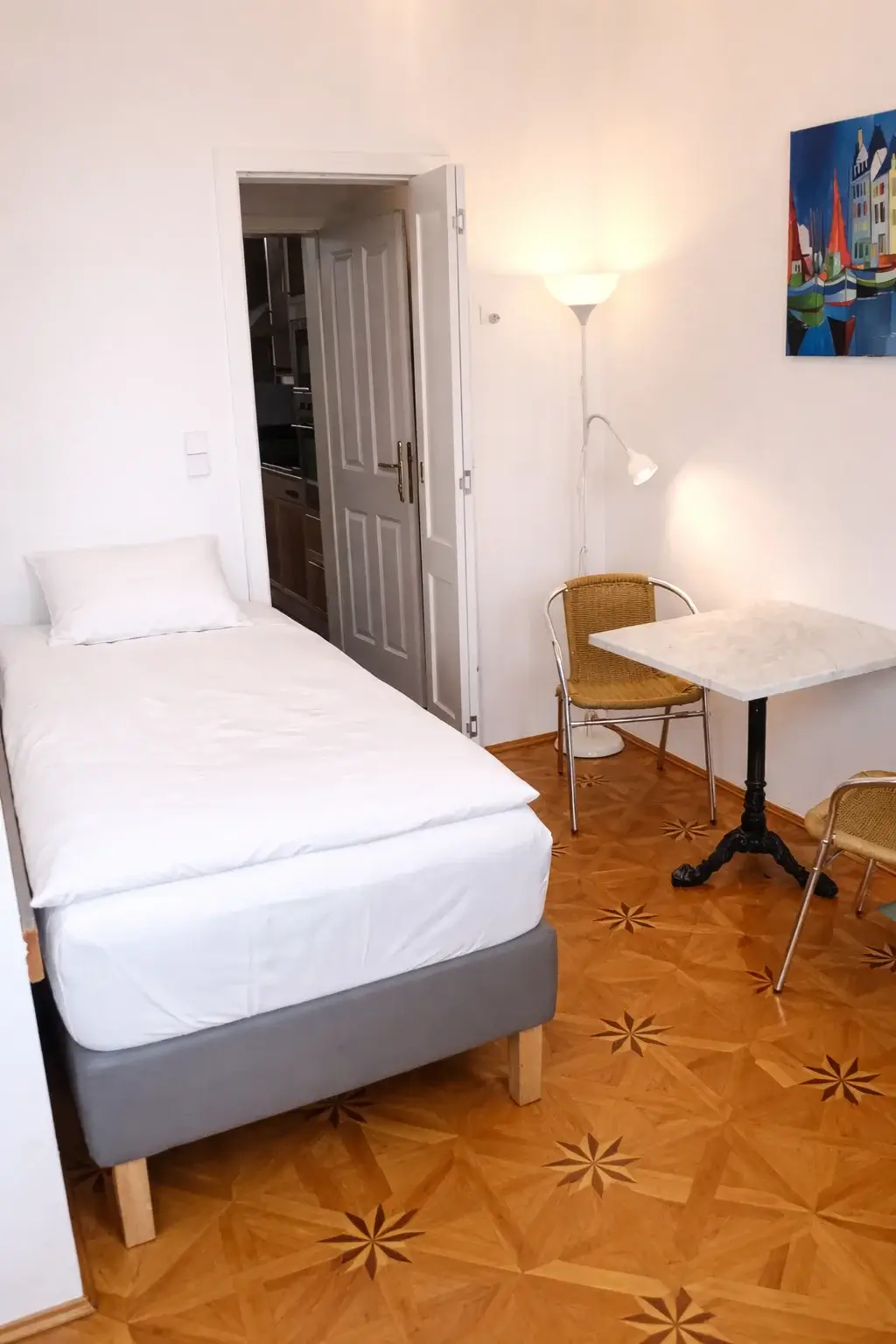 Im Schlafzimmer befindet sich ein gemütliches Einzelbett, und die begehbare Garderobe bietet reichlich Stauraum für Kleidung und persönliche Gegenstände. Durch die gartenseitigen Kastenfenster gelangt viel Tageslicht in die Wohnung und sorgt für eine ruhige und angenehme Atmosphäre.