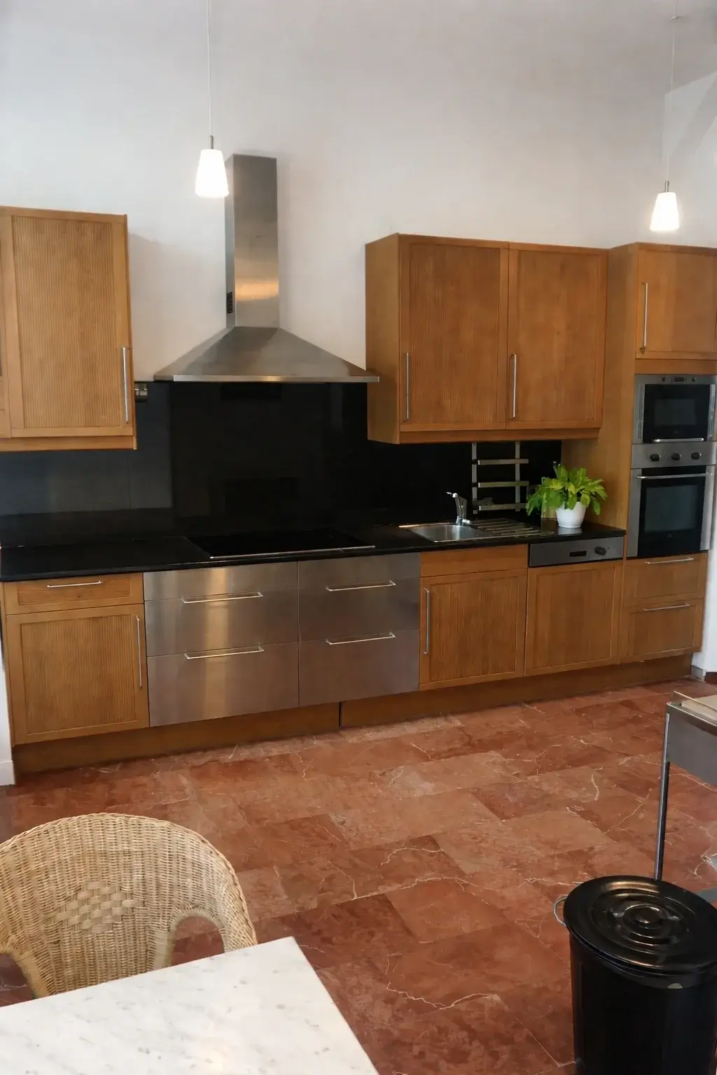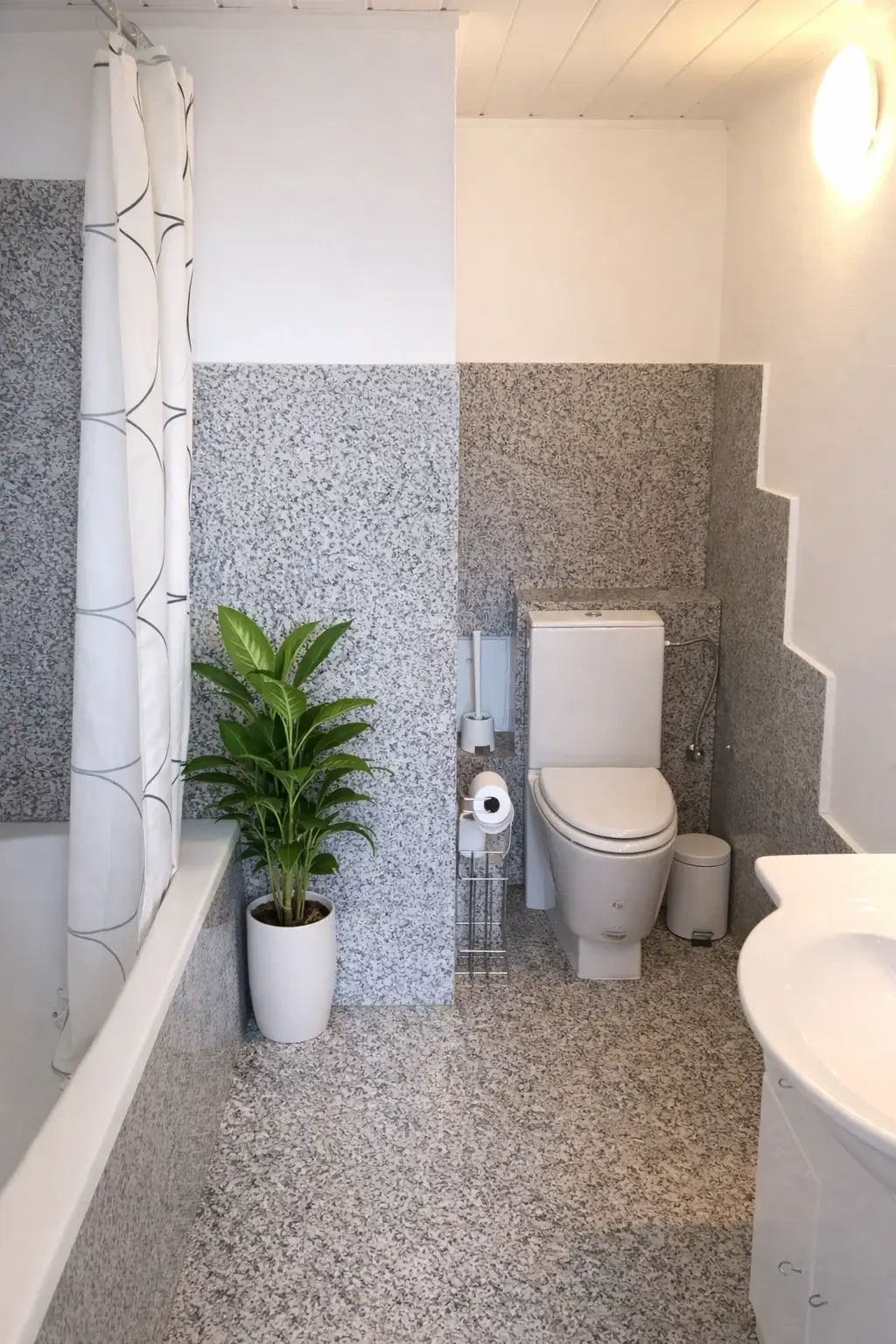 Das Badezimmer ist mit einer Badewanne ausgestattet und lädt zum Entspannen ein. Das WC ist praktisch im Badezimmer integriert. Die moderne Küche bietet ausreichend Platz und ist mit einem großzügigen Side-by-Side-Kühlschrank ausgestattet, der viel Stauraum für Lebensmittel bietet.