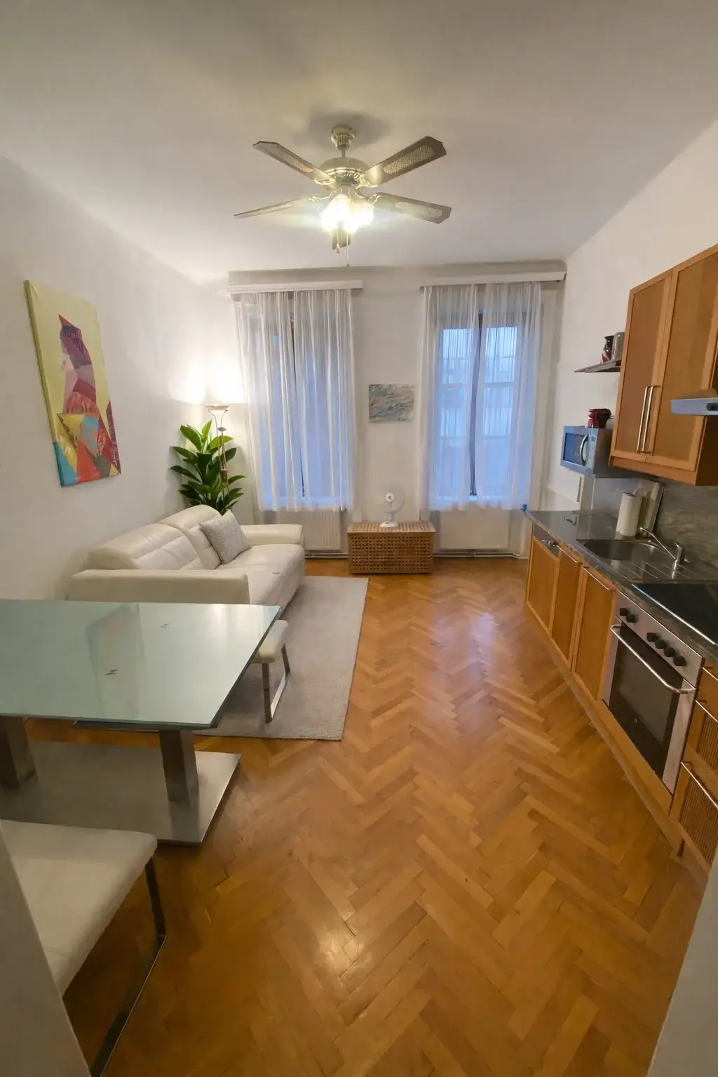 This cozy 42 m² apartment at Linzerstraße 79 , 1140 Vienna on the first floor for two people is offert als a secondary residence. It offers stylish furnishings and a well-thought-out layout, ideal for comfortable living. The high-quality parquet flooring gives the rooms a warm and inviting atmosphere, while a combination of underfloor heating and radiators ensures pleasant warmth throughout.